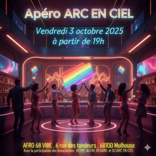 Il y environ un an plusieurs associations LGBTQIA++ de Mulhouse ont souhaité mettre en place une soirée APERO ARC EN CIEL. Depuis novembre 2024 nous nous sommes retrouvé.e.s régulièrement d’abord au bar Entre entre-Deux de Mulhouse. Nous les remercions pour leur accueil. Le succès est au rendez vous, alors nous allons perpétuer l’opération tous les 1er vendredi du mois! Attention depuis le mois de septembre 2025 nous avons changé de lieu !! RDV à AFRO68 VIBES , 6 rue des tondeurs – Mulhouse Le Vendredi 3 octobre à partir de 19h. Nous changeons de formule et de lieu pour vous proposer des soirées plus dansantes avec possibilité de karaoké. Cet Apéro Arc en ciel est un moment où nous pouvons tou.te.s nous rencontrer autour d’un verre pour partager, se retrouver et échanger en toute liberté. Poursuivre en 2025 et 2026 la tenue de cet évènement régulier marquant la vie LGBTQIA+ à Mulhouse sera important. Ce doit être un lieu ouvert à tout le monde sans discrimination – L’ouverture d’esprit et le respect de chacun.e sont le fil conducteur de ces soirées. À très bientôt ! |